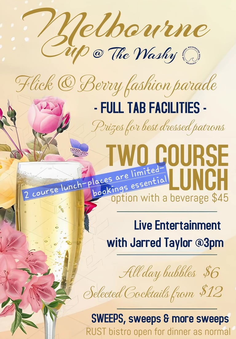 Melbourne Cup @ The Washy! Join us for a day of style, glamour, and celebration. Don't miss out on the fabulous fashion parade by Flick & Berry, delicious nibbles, all day bubbles and select Cocktails. πππΎ 2 Course Lunch by RUST - Bookings are essential, places are limited π